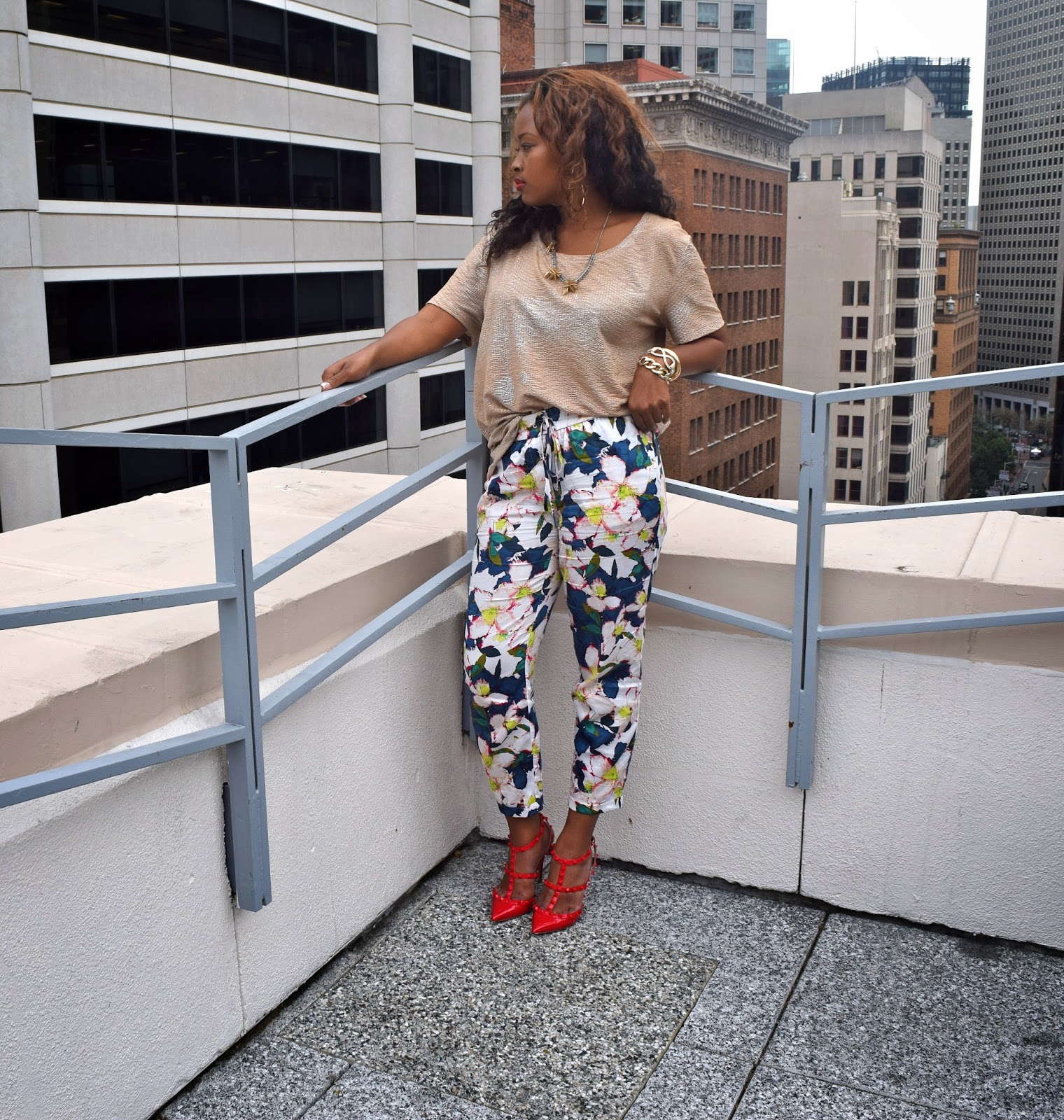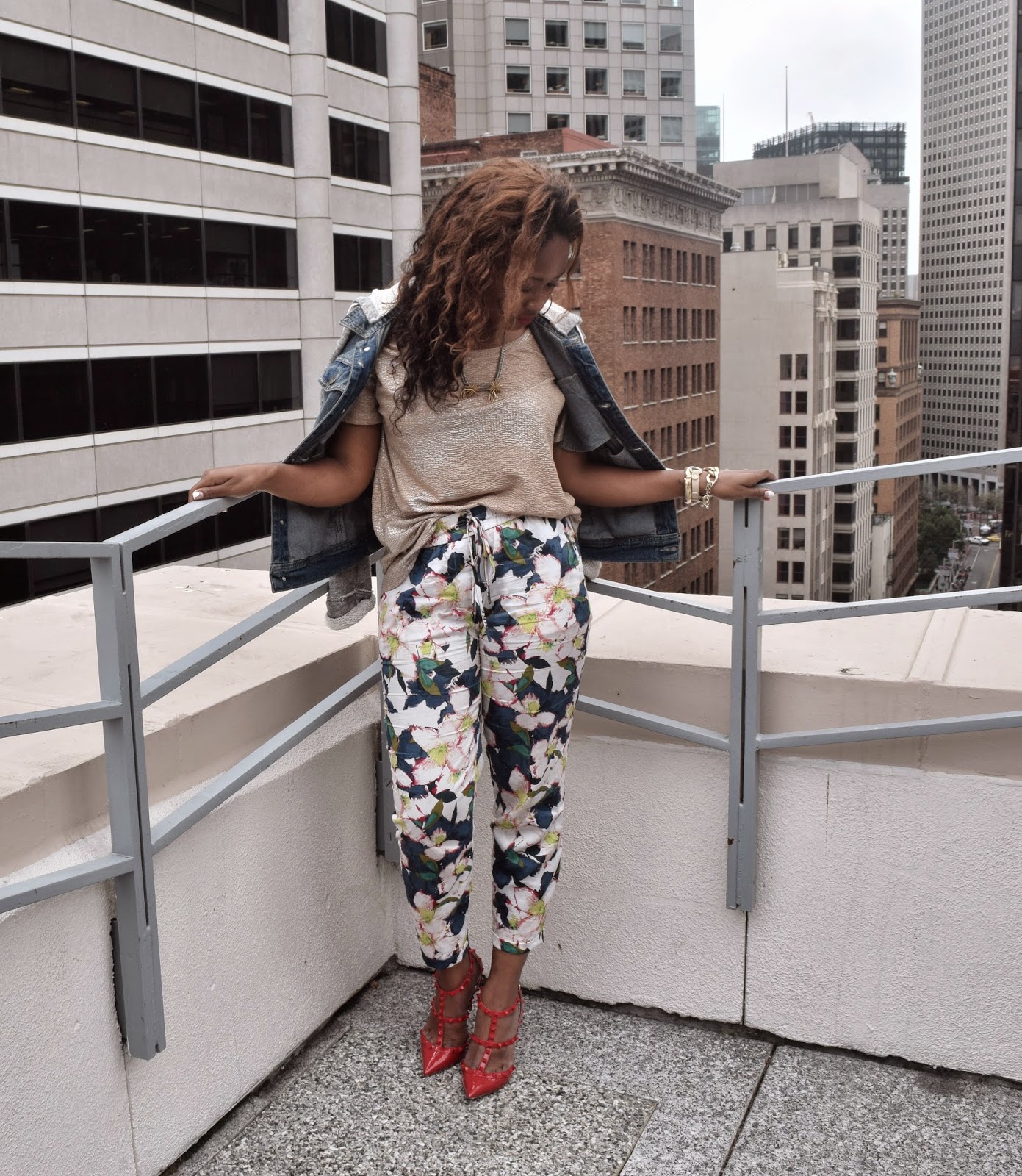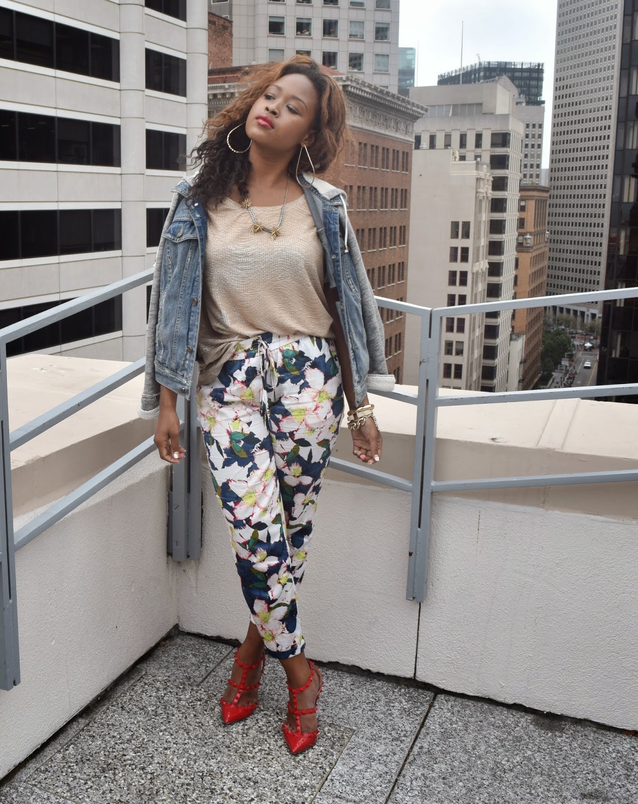 Jacket: Free People Denim Jacket. Blouse: HM(Old). Pant:J.Crew:(spring collection. new print)Floral Pant. Shoes: Valentino Punkouture Rockstud. Accessories: J. Crew. Lipstick: Mac Vivia Glam Rihanna RIRI.