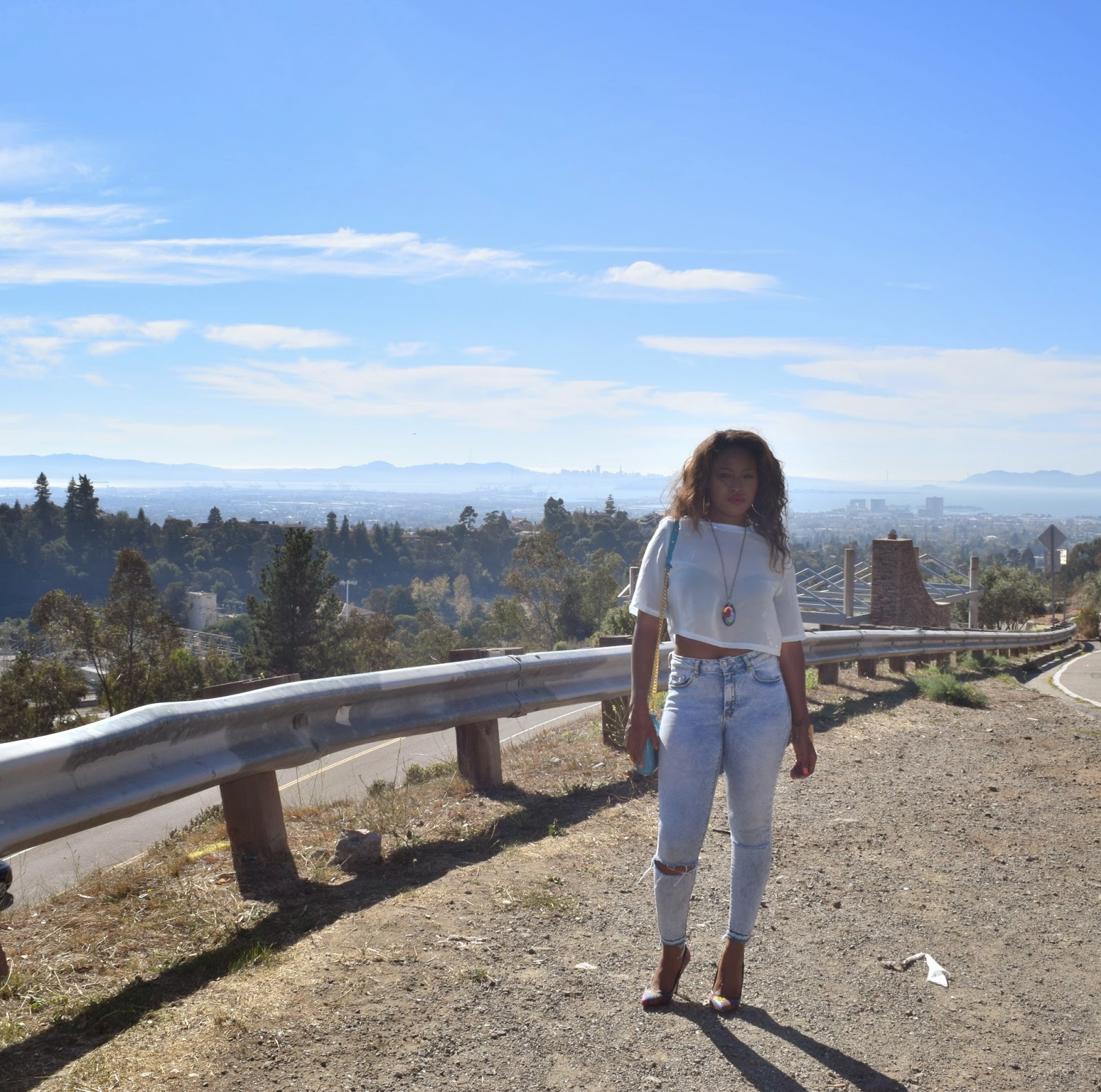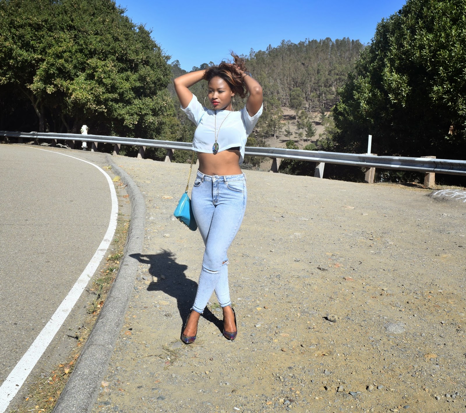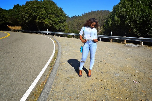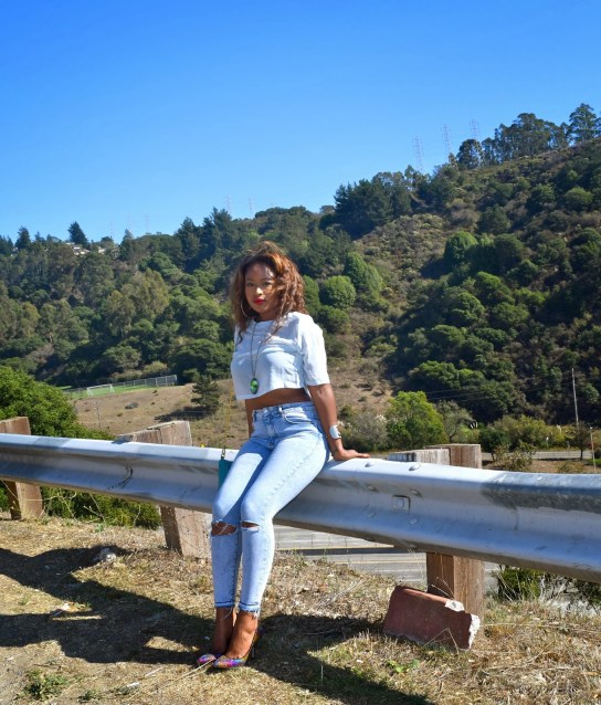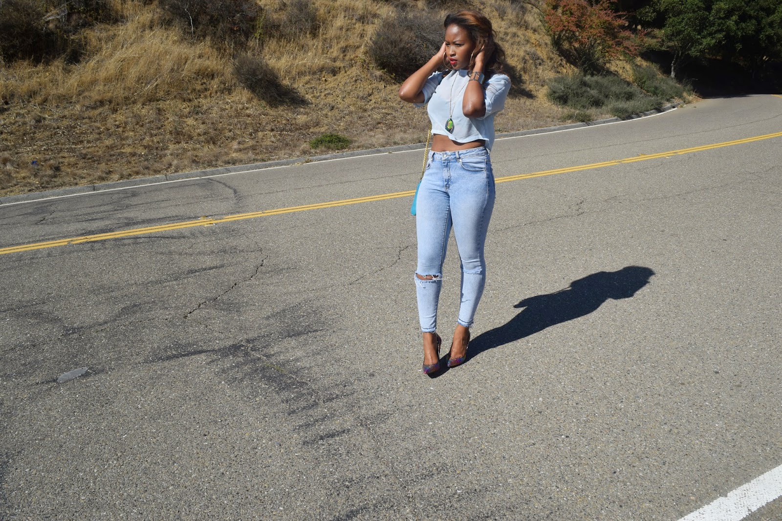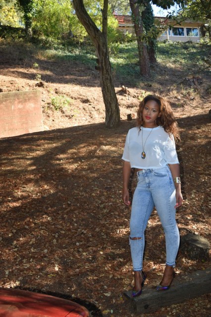 So, I love jeans with holes, but I have just one pet peeve about them. I dislike when they don’t hit the knee! With these jeans I have literally tried everything to get them to hit the knee… so bare with me! Other than that, I enjoy mixing a crop top with high waisted jeans. This look makes me feel sexy without feeling uncomfortable during the daytime. This shirt is very sheer which I love! The sexy silhouette of a black bra… I’m all about it. Once again it’s sexy but not overly sexy and I feel completely comfortable rolling up to the schoolhouse to pick up my girl! Its hump day yall!!!