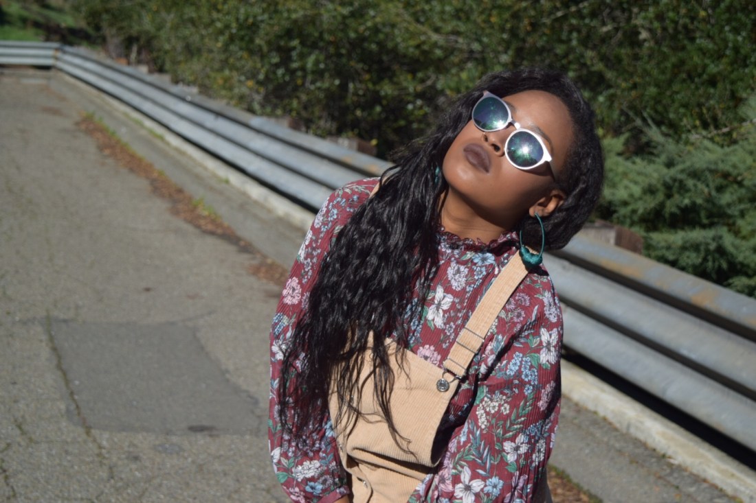 My first look is a floral printed blouse in a dark color to assure my look feels seasonally appropriate. I also added overalls in a neutral color with a heavier corduroy fabrication which gives it a more cold weather feel. The denim jacket, well… it just felt right and helped balance out the color palette. Lastly, adding grey socks help tone down the white booties making the non-expectant pop of color work well with the rest of the pieces.