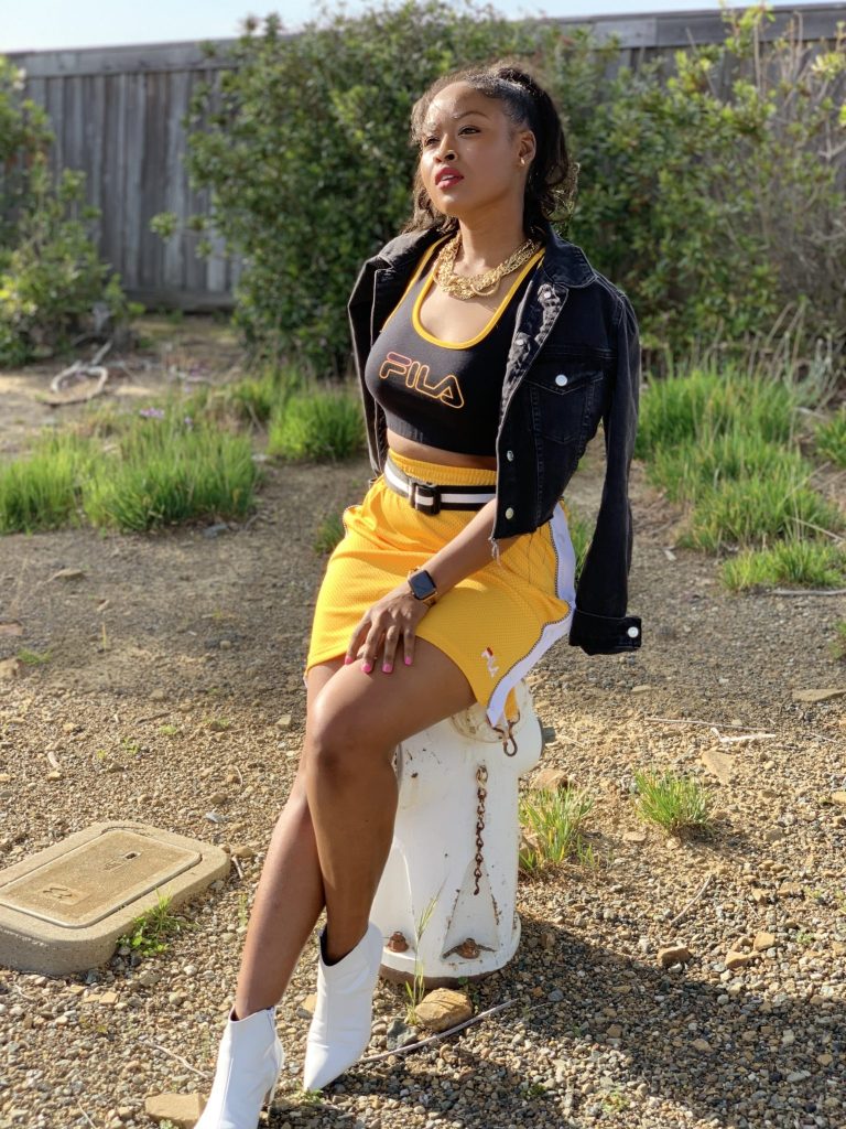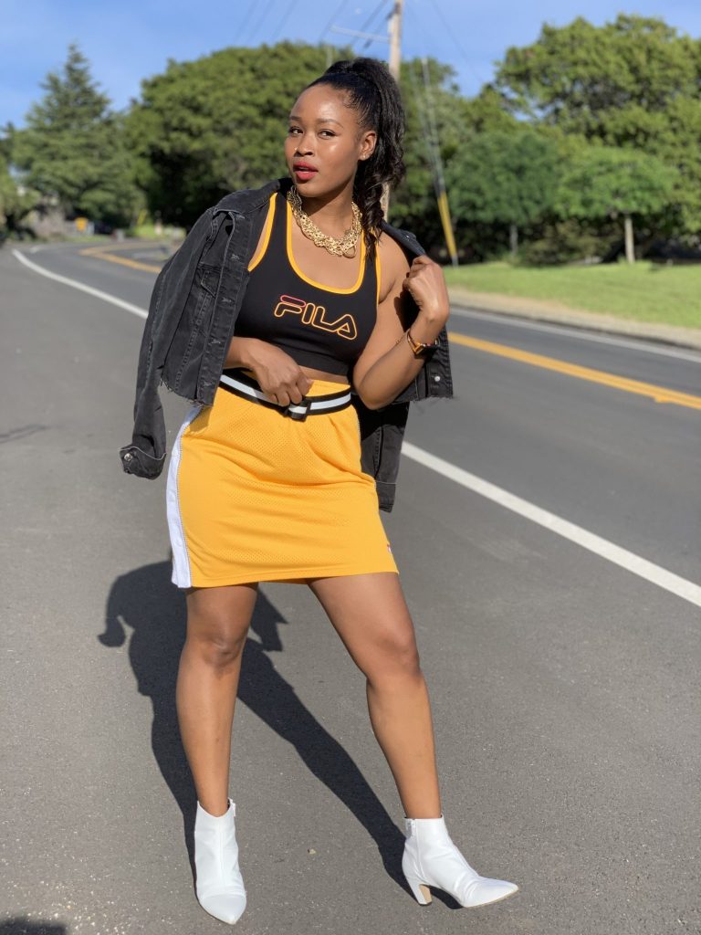 Sports Bra: Fila. Skirt: Fila. Booties: Asos. Jacket: Topshop. Necklace. Belt: Trouve. Oldie but a goodie!